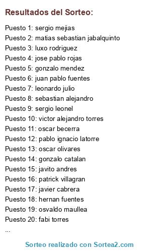 Lista de participantes: sergio mejias, sebastian alejandro, rxben jara, alex fhrann, patrick villagran, osvaldo maullea, daniel daniroquai, carlos vergara, diego cifuentes, claudio tumba, cristian villalobos, gonzalo catalan, abraham isaac, jose contuliano, javito andres, pablo ignacio latorre, ketchup ignacio, rodrigo andres, sergio leonel, alex aguirre, jose miguel miranda, diego ignacio, cristian vargas, oscar becerra, felipe aguilera, marcelo valle, pablo palominos, mauricio araya labra, luciano miranada, gonzalo pizarro, jose elias sarmiento, fabi torres, hernan fuentes, sergio palma, sebastian ojeda, sebastian maldonado, rene cortes, leonardo julio, lobito chido, leo chino, gonzalo mendez, damian henriquez, jose pablo rojas, luxo rodriguez, crhistoper alexis, matias de rokha, diego andres torrs, oscar olivares, juan pablo fuentes, matias ignacio reinoso, moises badilla, nicolas fernandez, sebastian albarran, ian morales, fernando aguilera, juan andres, matias sebastian jabalquinto, diego sepulveda, lucas melville, toal dl bulla, alberto rodriguez, victor alejandro torres, javier cabrera, Puesto 64: Ecuador.