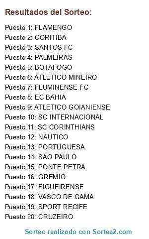 Lista de participantes: ATLETICO GOIANIENSE, ATLETICO MINEIRO, EC BAHIA, BOTAFOGO, SC CORINTHIANS, CORITIBA, CRUZEIRO, FIGUEIRENSE, FLAMENGO, FLUMINENSE FC, GREMIO, SC INTERNACIONAL, NAUTICO, PALMEIRAS, PONTE PETRA, PORTUGUESA, SANTOS FC, SAO PAULO, SPORT RECIFE, VASCO DE GAMA.