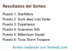 Lista de participantes: Suck deez nutz Vader, StarKillers, Ticos Storm Troopers, Millennium Squad, Espartanos, Guerreros Sith.