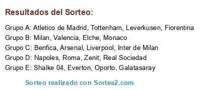 Lista de participantes: Zenit, Galatasaray, Fiorentina, Inter de Milan, Milan, Liverpool, Arsenal, Tottenham, Oporto, Roma, Everton, Leverkusen, Benfica, Real Sociedad, Valencia, Monaco, Atletico de Madrid, Elche, Napoles, Shalke 04.