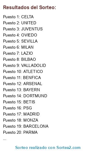 Lista de participantes: MADRID, BILBAO, LAZIO, BAYERN, BOCA, BENFICA, MILAN, SEVILLA, CELTA, PSG, JUVENTUS, BARCELONA, BETIS, DORTMUND, PARMA, MONZA, OVIEDO, MIAMI, SHANGHAI, ARSENAL, GIJON, UNITED, VALLADOLID, ATLETICO.