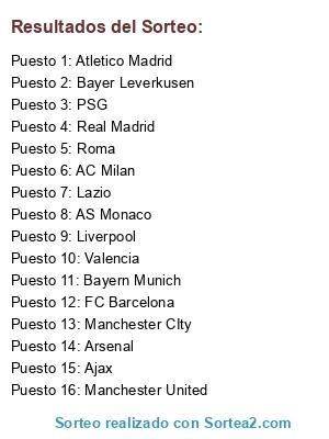 Lista de participantes: Arsenal, Valencia, Real Madrid, Bayern Munich, Manchester CIty, Ajax, Roma, FC Barcelona, AS Monaco, Atletico Madrid, Liverpool, Manchester United, Bayer Leverkusen, PSG, AC Milan, Lazio.