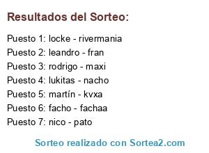 Lista de participantes: facho - fachaa, locke - rivermania, rodrigo - maxi, lukitas - nacho, leandro - fran, nico - pato, martín - kvxa.