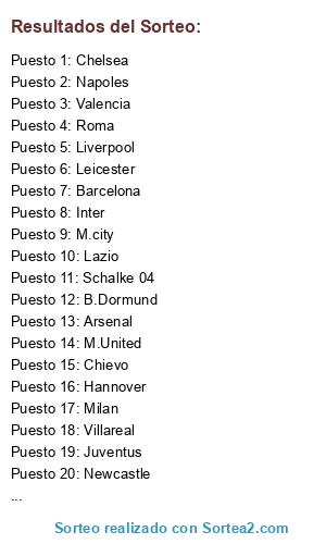 Lista de participantes: Bayern Munich, B.Dormund, Schalke 04, Leverkusen, Hannover, Eintracht, Barcelona, Valencia, R.Madrid, At.Madrid, Villareal, Oviedo, R.Sociedad, M.city, M.United, Tottenham, Newcastle, Chelsea, Liverpool, Arsenal, Everton, Leicester, Napoles, Juventus, Inter, Roma, Lazio, Milan, Fiorentina, Torino, Sampdoria, Chievo.