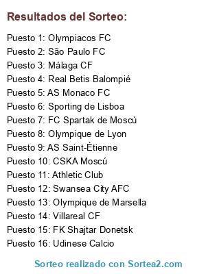 Lista de participantes: Athletic Club, Swansea City AFC, CSKA Moscú, FK Shajtar Donetsk, Olympique de Marsella, São Paulo FC, Real Betis Balompié, Udinese Calcio, Villareal CF, Olympique de Lyon, AS Monaco FC, Olympiacos FC, FC Spartak de Moscú, Sporting de Lisboa, Málaga CF, AS Saint-Étienne.