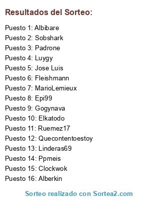 Lista de participantes: Padrone, Quecontentoestoy, MarioLemieux, Epi99, Linderas69, Clockwok, Ruemez17, Ppmeis, Gogynava, Luygy, Alberkin, Elkatodo, Fleishmann, Sobshark, Jose Luis, Albibare.