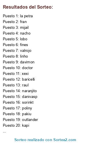 Lista de participantes: baricelli, xexi, lobo, poliny, linho, la petra, fran, kapi, doctor, naranjito, valrojo, sorinkt, nacho, raul, curtis, davimon, outlander, danivasp, pakiu, fines, mijail, charly.