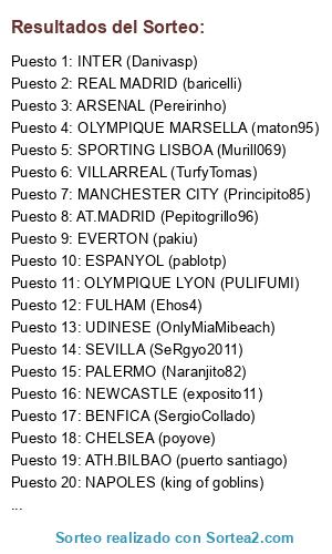 Lista de participantes: REAL MADRID (baricelli), FC BARCELONA (Pedrofox), AT.MADRID (Pepitogrillo96), MALAGA (rastamanlasarte), VALENCIA (alexnov89), SEVILLA (SeRgyo2011), VILLARREAL (TurfyTomas), ATH.BILBAO (puerto santiago), BETIS (manolozon), ESPANYOL (pablotp), OSASUNA (thecatonair), MANCHESTER UNITED (brayanivan1990), MANCHESTER CITY (Principito85), CHELSEA (poyove), TOTTENHAM (poliny), ARSENAL (Pereirinho), LIVERPOOL (lobitooooo), ASTON VILLA (pablo1975cordob), NEWCASTLE (exposito11), EVERTON (pakiu), FULHAM (Ehos4), STOKE CITY (Harry Petas 666), MILAN (colon666), INTER (Danivasp), JUVENTUS (MIKEY10 ElmalO), NAPOLES (king of goblins), ROMA (x SES x), FIORENTINA (DAVILON69), LAZIO (guss km), GENOA (R0BLES7), UDINESE (OnlyMiaMibeach), PARMA (maturetoro666), PALERMO (Naranjito82), BAYERN MUNICH (juannee10), OPORTO (Jayoldi), OLYMPIQUE MARSELLA (maton95), PSG (raulmar), OLYMPIQUE LYON (PULIFUMI), SPORTING LISBOA (Murill069), FENERBAHCE (delcampo88), BESIKTAS (heblesj), LILLE (kikofer), BENFICA (SergioCollado), ZENIT (XxAfro8xX).