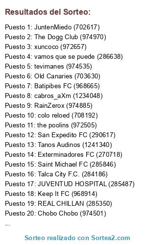 Lista de participantes: Satisfaction F.C (704960), xuncoco (972657), Batipibes FC (968665), Chobo Chobo (974501), Ginga! (973980), RainZerox (974885), Old Canaries (703630), Los MacaNuiToS F.C (705761), JUVENTUD HOSPITAL (285487), C.D.Unión.Chile (1241824), tevimanes (974535), colo reloed (708192), Big_Angelus Club (969832), LOS CAPUCHAS FC (286838), The Dogg Club (974970), union metropolis (702263), Saint Andrew (975123), Hombres de Selk (270277), vamos que se puede (286638), Saint Michael FC (285846), Tanos Audinos (1241340), REAL CHILLAN (285350), the poolins (972505), Keep It FC (968914), Exterminadores FC (270718), JuntenMiedo (702617), REAL SANDUNGUERO G (285945), los bT_Tlladiktos (707957), cabros_aXm (1234048), Talca City F.C. (284186), San Expedito FC (290617), Santiago Spurs (702997).
