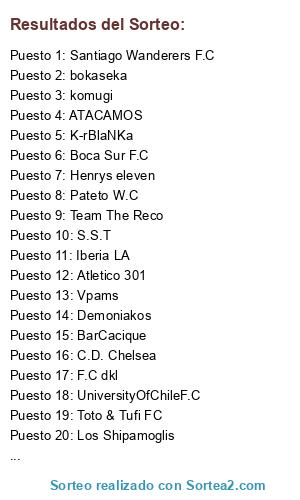 Lista de participantes: team washapela , C.S y D. Mafia S.A. , bokaseka , Team The Reco , Bulladictos F.C. , Vpams , Gera's , Boca Sur F.C , F.C dkl , u.de chile10 , S.S.T , Henrys eleven , Universidad catolica cf , ATACAMOS , Toto & Tufi FC , PICHOYO F.C, VALOCOS F.C. , K-rBlaNKa , Los Shipamoglis , Demoniakos , BarCacique , atlety , komugi , Santiago Wanderers F.C , Pateto W.C , Sin Limites , Huracan Naranja , Iberia LA , C.D. Chelsea , UniversityOfChileF.C, Atletico 301 , Trieste F.C.