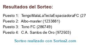 Lista de participantes: TengoMalaLaTeclaEspaciadoraFC (270697) , C.A. Santos de Oro (972503) , Tono FC (286749) , Albo-master (1233881).