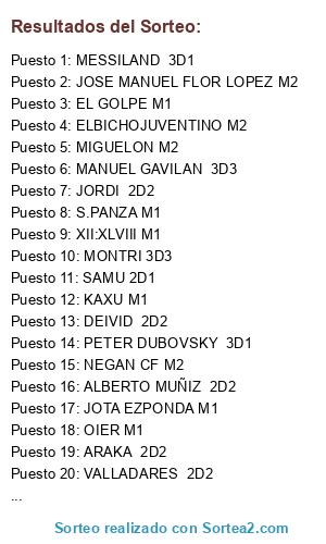 Lista de participantes: JOMICHEQUE M2, NEGAN CF M2, MIGUELON M2, J.F.M. M2, JOSE MANUEL FLOR LOPEZ M2, MEACOLONIAS M2, PERICO17 M2, JOTA M2, ELBICHOJUVENTINO M2, AIUB M2, NEFERMAAT M2, ALEX CF M2, LUKA TRUNKS M2, CHUPE26 M2, CHARLY RM M1, MAGIC ORELLUT M1, JAVITO VALENCIANISTA M1, DANI CORLEONE M1, ROMERO M1, EL GOLPE M1, XII:XLVIII M1, S.PANZA M1, OIER M1, LUCA TONI M1, BEGINES25 M1, GRAN CAPITAN M1, JOTA EZPONDA M1, KAXU M1, AL- 2D2, JAVIER OLIVER ATOM 2D2, ISLEÑO 2D2, DEIVID 2D2, ARAKA 2D2, ALBERTO MUÑIZ 2D2, DIEGUITO FIGUEROA 2D2, DAMI 2D2, JORDI 2D2, VALLADARES 2D2, ISMA F, 2D2, SAUL GOODMAN 2D2, SOBARRIBA 2D1, SERPA MB 2D1, REN HONJO 2D1, MANKENEGAN 2D1, MORTA 2D1, SAMU 2D1, PEDROCHE 2D1, DIEGOSCOOBY 2D1, KARRACEDO 2D1, LEANDRO 2D1, SUSO DEL RIO 2D1, STRESSHUNTER 3D1, ZERRADA 3D1, MESSILAND 3D1, PETER DUBOVSKY 3D1, MR.CARLETO 3D1, DANIMADOR 3D2, IVAN RAKITIK 3D2, BORJILLA 3D2, ROBERWISE 3D2, FRANCHINOALCALA 3D3, MANUEL D 3D3, MONTRI 3D3, MANUEL GAVILAN 3D3.