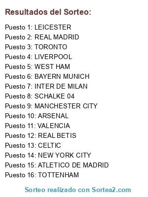 Lista de participantes: ATLETICO DE MADRID, SCHALKE 04, WEST HAM, LEICESTER, REAL BETIS, TORONTO, ARSENAL, INTER DE MILAN, NEW YORK CITY, REAL MADRID, MANCHESTER CITY, BAYERN MUNICH, TOTTENHAM, LIVERPOOL, VALENCIA, CELTIC.
