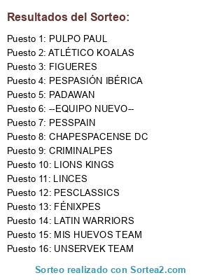 Lista de participantes: ATLÉTICO CEUTA, ATLÉTICO KOALAS, CHACALES, GREEN DUCKS, HISPANIA PES, INVADERS, LATIN WARRIORS, LIGAPES, LINCES, LOBOS DEL PES, MALAKITOS IS SHARKS, MIS HUEVOS TEAM, MOTRILPES, PESFRIENDS, PESTIVAL KILLERS, PUMAS.