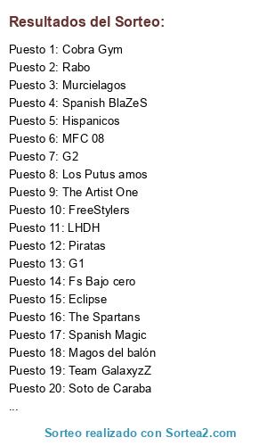Lista de participantes: Spanish BlaZeS, La Vieja Guardia, The Artist One, Fs Bajo cero, Lokos der Furbo, Rc Recreativo, El arca de Noe, AC Deja Vu, Typical Spanish, G1, G2, Rabo, Eclipse, Piratas, LHDH, The Spartans, MVP Returns, Hispanicos, FreeStylers, Cobra Gym, Murcielagos, Magos del balón, Cosmos, Team GalaxyzZ, Legendario, Mapped, Soto de Caraba, MFC 08, Lo clásico, Coka Juniors, Los Putus amos, Spanish Magic.