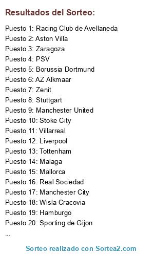 Lista de participantes: Athletic Club, Atlético de Madrid, Barcelona, Granada, Malaga, Betis, Espanyol, Mallorca, Madrid, Sporting de Gijon, Real Sociedad, Zaragoza, Sevilla, Valencia, Villarreal, Oporto, Sporting de Lisboa, Benfica, Milan, Fiorentina, Roma, Inter de Milan, Juventus, Napoli, Lazio, Udinese, Palermo, Borussia Dortmund, Bayern Munich, Schalke 04, Hamburgo, Bayer Leverkusen, Stuttgart, Werder Bremen, Arsenal, Aston Villa, Chelsea, Everton, Fulham, Liverpool, Manchester City, Manchester United, Newcastle, Norwich, Tottenham, Stoke City, Losc Lille, Lyon, Marsella, PSG, Girondis Bordeaux, AZ Alkmaar, Ajax, Shakthar Donetsk, Zenit, PSV, CSKA de Moscow, Wisla Cracovia, Boca Juniors, Velez, Estudiantes de la Plata, Racing Club de Avellaneda, Santos, Sao Paulo.