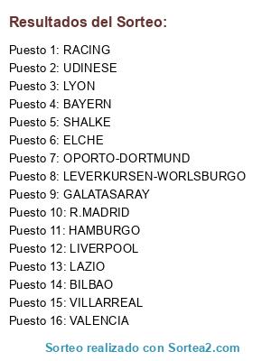 Lista de participantes: LIVERPOOL, HAMBURGO, ELCHE, BILBAO, R.MADRID, VILLARREAL, RACING, LYON, VALENCIA, BAYERN, UDINESE, GALATASARAY, LAZIO, SHALKE, OPORTO-DORTMUND, LEVERKURSEN-WORLSBURGO.