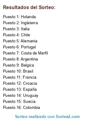 Lista de participantes: Belgica, Inglaterra, Francia, Alemania, Italia, Holanda, Portugal, España, Argentina, Brasil, Colombia, Chile, Uruguay, Suecia, Costa de Marfil, Croacia.