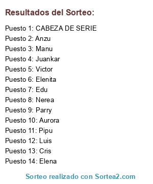 Lista de participantes: Parry, Nerea, Luis, Elena, Elenita, Manu, Anzu, Juankar, Victor, Aurora, Cris, Pipu, Edu, CABEZA DE SERIE.