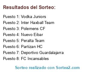 Lista de participantes: Peralta Team, Inter Haxball Team, Nuevo Eibar, Polemens CF, Vodka Juniors, Partizan HC, FC Incansables, Deportivo Guardalajarra.