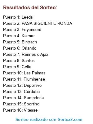 Lista de participantes: Santos, Fluminense, Las Palmas, Feyenoord, Vitesse, Sporting, Eintrach, Sampdoria, Córdoba, Celta, Leeds, Kalmar, Orlando, Rennes o Ajax, Deportivo, PASA SIGUIENTE RONDA.