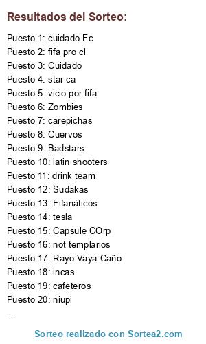 Lista de participantes: cafeteros, star ca, latin shooters, fifa pro cl, not templarios, carepichas, drink team, niupi, incas, Longa Mecanica, vicio por fifa, cuidado Fc, Rayo Vaya Caño, Fifanáticos, Cuervos, Deportivo Uruguayo, Zombies, Capsule COrp, Badstars, Sudakas, tesla, Cuidado.