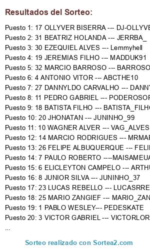 Lista de participantes: 1 PABLO WESLEY--- PEDESKATE, 2 WEYDNER BRUNO --- BRUNO-WARHAWK, 3 VICTOR GABRIEL --- VICTORLORETO, 4 ANTONIO VITOR --- ABCTHE10, 5 GUSTAVO HENRIQUE --- CLIMA2012, 6 ELICLEYTON CAMPELO --- ARTHUR_BENICIO, 7 PAULO ROBERTO ----MAISAMEUAMOR, 8 JUNIOR SILVA --- JUNINHO_37, 9 CARLOS LIMA --- CLIMA1971, 10 WAGNER ALVER --- VAG_ALVES, 11 PEDRO GABRIEL --- PODEROSOPG, 12 JOSÉ AUGUSTO HOLANDA ---- GOSJAN, 13 LUCAS MOREIRA --- LUCAS_SHANX, 14 MARCIO RODRIGUES --- MRMARCIO005, 15 GILDEAN GOMES --- GIL-TERESINA, 16 ALAN SILVA --- ALLAN-CRIS, 17 OLLYVER BISERRA --- DJ-OLLYVER, 18 BATISTA FILHO --- BATISTA_FILHO10, 19 JEREMIAS FILHO --- MADDUK91, 20 JHONATAN --- JUNINHO_99, 21 ANTONIO MARREIROS JUNIOR --- AMJUNIORBR, 22 ARIELSON OLIVEIRA --- OITO_OLIVEIRA, 23 LUCAS REBELLO --- LUCASRREBELLO, 24 CAYO MILTON --- CMCM_BROTO, 25 MARIO ZANGIEF --- MARIO_ZANGIEF, 26 FELIPE ALBUQUERQUE --- FELIPE_ADCL, 27 DANNYLDO CARVALHO --- DANNYLDO, 28 ATTILA DE HOLANDA --- attilamagao2, 29 BRUNO LIBERATO --- Brunoliberato05, 30 EZEQUIEL ALVES --- Lemmyhell, 31 BEATRIZ HOLANDA --- JERRBA_, 32 MARCIO BARROSO --- BARROSOMARCIO.