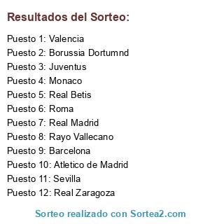 Lista de participantes: Sevilla, Rayo Vallecano, Barcelona, Atletico de Madrid, Valencia, Monaco, Juventus, Real Betis, Real Zaragoza, Roma, Real Madrid, Borussia Dortumnd.