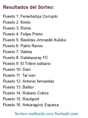 Lista de participantes: El Trilero solitario, Felipe Prieto, Fenerbahçe Corrupto, Raulsport, Besiktas Jimnastik Kulübü, Tal ivan, Baltior, Ankaragücü Esparza, Valdes, Rome, Rubens Cobos, Dani, Antonio fernandez, Pablo Ramis, Galatasaray FC, Kristo.