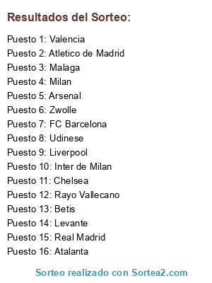 Lista de participantes: Inter de Milan, Milan, Valencia, Liverpool, Rayo Vallecano, Betis, FC Barcelona, Atletico de Madrid, Chelsea, Atalanta, Udinese, Arsenal, Malaga, Real Madrid, Zwolle, Levante.
