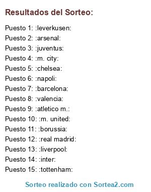 Lista de participantes: :barcelona:, :juventus:, :m. city:, :real madrid:, :tottenham:, :arsenal:, :borussia:, :chelsea:, :atletico m.:, :inter:, :liverpool:, :m. united:, :napoli:, :valencia:, :leverkusen:.