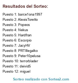 Lista de participantes: Popeos, terrorblader, miguel, deivid5, Hardfran, Escorpio, barce1ona1997, JacyHV, AlexisToretto, PRTIllegalko, Nekus, Peter10pelusa.