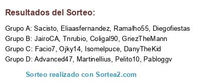 Lista de participantes: JairoCA, Ramalho55, Pelito10, Facio7, Pabloggv, Diegofiestas, DanyTheKid, Eliaasfernandez, Tnrubio, Sacisto, Isomelpuce, GriezTheMann, Ojky14, Advanced47, Coligal90, Martinellius.
