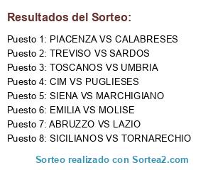 Lista de participantes: SIENA VS MARCHIGIANO, ABRUZZO VS LAZIO, CIM VS PUGLIESES, EMILIA VS MOLISE, PIACENZA VS CALABRESES, SICILIANOS VS TORNARECHIO, TOSCANOS VS UMBRIA, TREVISO VS SARDOS.