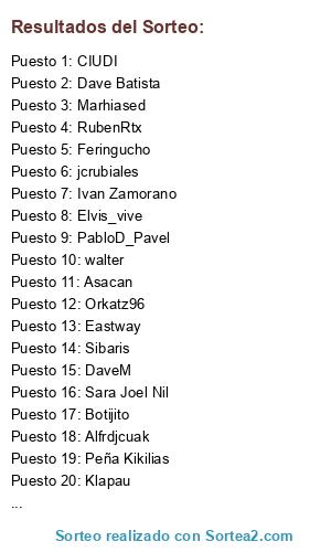 Lista de participantes: Acaballero, Adri_MaD, Adriel, Advenedizo, Aldebaran, AlexGP, Alfrdjcuak, Alsvinn, Alvarol, Amc81granada, Amitx, Andreu35, Antonio_málaga, AntonioJesus_Huelin, Arranz, Asacan, atp, Balaverde19, Banco Di Málaga, Botijito, Calvin_k15, Canabet, Carolo, Catacroc, Chekos, Cid_campeador, Cincuelo, CIUDI, Clas Cajastur, Dakar, DaMaCre, Danacik, Dani_cj, Dave Batista, DaveM, De la Penya, DeliriumTremens, Eastway, Elvis_vive, Emihc, Esplu, Feringucho, Fernanpopi, FguardiaP, Fly, Furgen, Galba, Ganon, Gomez99, Grit Enver, Hernan M, Hill, IBM, Ismogo, Ivan Zamorano, Jacob., Jaimeguada, Javierporfavor, jcrubiales, Jmazo, John Starks, Jorgemtnez, Jose fc, Joserrarodri, Josu93, Juank_09, Klapau, Kliel, La Jefa, Laturn, Lpi, Luis-donosti, Marhiased, Marioarias95, Markelfdz_, MartensitaRevenida, Monroe Bell, Nasito10, Orkatz96, Oso Pinoso, PabloD_Pavel, Pablogomez, Paches19, Pacojobacho, Padovan0, Peli, Peña Kikilias, Pepet76, Phosk, Pingudaa, PRFOREVER, Ratamugre, Ricard_mv, Ricardo27, RubenRtx, Sara Joel Nil, Sauber, SC30KT11, Sdmasche, Sercarde.92, Shinchan, Sibaris, SrWanWan, Surimi, TOBIN TAX, Touche amore, TXIN, Unaizukic, walter, Wapimach Bike, Wggomezvpalf, Winchester, Yugo Uds, Zuga07.