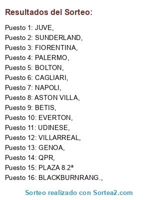 Lista de participantes: UDINESE,, CAGLIARI,, JUVE,, GENOA,, BLACKBURNRANG.,, FIORENTINA,, VILLARREAL,, SUNDERLAND,, BETIS,, BOLTON,, ASTON VILLA,, NAPOLI,, QPR,, EVERTON,, PALERMO,, PLAZA 8.2ª.