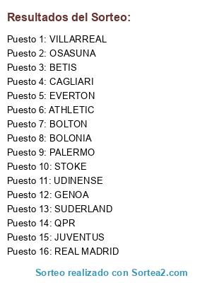 Lista de participantes: JUVENTUS, BOLONIA, CAGLIARI, ATHLETIC, VILLARREAL, OSASUNA, STOKE, QPR, UDINENSE, SUDERLAND, BETIS, GENOA, REAL MADRID, BOLTON, PALERMO, EVERTON.