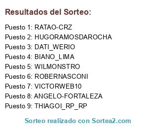 Lista de participantes: ROBERNASCONI, WILMONSTRO, VICTORWEB10, BIANO_LIMA, RATAO-CRZ, DATI_WERIO, ANGELO-FORTALEZA, HUGORAMOSDAROCHA, THIAGO_RP_RP.