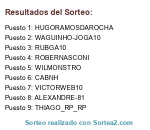 Lista de participantes: WILMONSTRO , ROBERNASCONI, THIAGO_RP_RP, WAGUINHO-JOGA10, VICTORWEB10, ALEXANDRE-81, HUGORAMOSDAROCHA, RUBGA10, CABNH.