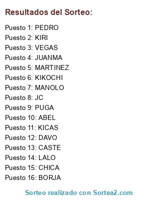 Lista de participantes: KIRI, CHICA, PUGA, JC, PEDRO, MANOLO, BORJA, KIKOCHI, DAVO, VEGAS, MARTINEZ, CASTE, KICAS, ABEL, LALO, JUANMA.