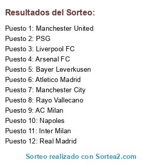 Lista de participantes: Rayo Vallecano, Atletico Madrid, Real Madrid, Inter Milan, Bayer Leverkusen, Liverpool FC, Manchester City, Manchester United, Arsenal FC, PSG, Napoles, AC Milan.
