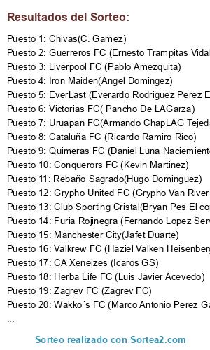 Lista de participantes: CA Xeneizes (Icaros GS), CD Roma (David Cedeño), Uchihas FC (Argenis Navarrete), Guerreros FC (Ernesto Trampitas Vidal), Zagrev FC (Zagrev FC), Grypho United FC (Grypho Van River), Pastores FC (Pastor Esnaiver Perea Cordoba), Chicali FC (Jesus Fg), Cataluña FC (Ricardo Ramiro Rico), Chelsea FC (Roberth Rodriguez), Wakko´s FC (Marco Antonio Perez Garces), Liverpool FC (Pablo Amezquita), Valkrew FC (Haziel Valken Heisenberg), Furia Rojinegra (Fernando Lopez Servil), Diablos Rojos FC (Jose Multicuentas Ronaldo Vidal), Uruapan FC(Armando ChapLAG Tejeda), Club Sporting Cristal(Bryan Pes El come Palomas), Steel Men( Kal Reza), Quimeras FC (Daniel Luna Naciemiento), Blue Figthers(Victor Uriel Flo El metsican), Chivas(C. Gamez), Victorias FC( Pancho De LAGarza), Conquerors FC (Kevin Martinez), Rebaño Sagrado(Hugo Dominguez), Iron Maiden(Angel Domingez), Herba Life FC (Luis Javier Acevedo), EverLast (Everardo Rodriguez Perez El Nuevo), Manchester City(Jafet Duarte).