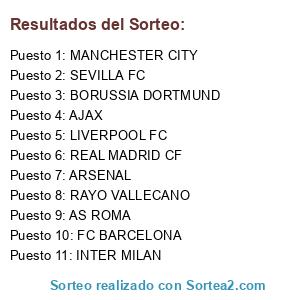 Lista de participantes: SEVILLA FC, REAL MADRID CF, BORUSSIA DORTMUND, AS ROMA, LIVERPOOL FC, INTER MILAN, MANCHESTER CITY, RAYO VALLECANO, ARSENAL, AJAX, FC BARCELONA.