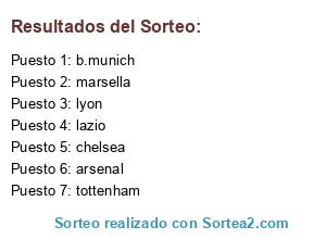 Lista de participantes: marsella, b.munich, arsenal, lyon, chelsea, tottenham, lazio.