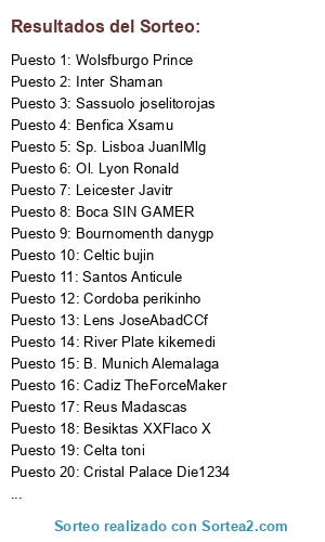 Lista de participantes: B. Dortmund SIN GAMER, B. Munich Alemalaga, Arsenal Rosino, Elche Stormfury, Malaga adrilito, Benfica Xsamu, Granada Halito, Leicester Javitr, Inter Shaman, Rayo Balles, Lugo diego_gallego, Cska Sergio0004, Bournomenth danygp, Reus Madascas, Madrid Divads, Psg Red Dutti, Zaragoza Maybecohen, West Ham misterserpico, Sassuolo joselitorojas, Cordoba perikinho, Schalke karlonchu, M. City Albertito 1, Pumas AndrewTorres, Pescara Sr. bokeron, Southampthon Simimc, New York Lordjavier, Chelsea CometHeaven, Lens JoseAbadCCf, M. United sergiotabascos, Cristal Palace Die1234, Ath. Bilbao Fonfenoso, Besiktas XXFlaco X, Valencia victub, Las Palmas saavexbox, Roma benniscuba, Sp. Lisboa JuanlMlg, Betis Chachiquesi, Barcelona tabascos, Depor borjituss, Tenerife Nandobel, Villarreal P3drito, River Plate kikemedi, Monaco pollosbrothers, Oviedo Kaos i Astur, Ol. Lyon Ronald, Liverpool MrMohamRam, Napoles Adoneri4, Cadiz TheForceMaker, Celtic bujin, Celta toni, Levante trunks, Leverkusen Charlyfifax, Boca SIN GAMER, Hamburgo Tagho, At. Madrid Adriantr, Eibar Joxepoth, Mirandes Pyra el capo, Petrolera Albervil, Milan SIN GAMER, Wolsfburgo Prince, Santos Anticule, Udinese SrPistolas, Juventus merayombasogo, Tottenham Alead.