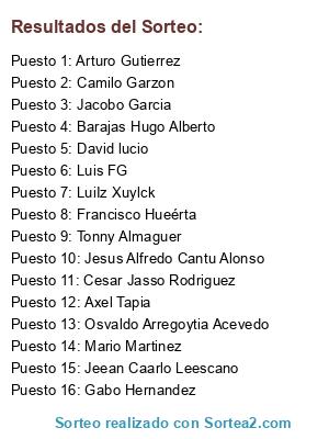 Lista de participantes: Osvaldo Arregoytia Acevedo, Jeean Caarlo Leescano, Francisco Hueérta, Gabo Hernandez, Jesus Alfredo Cantu Alonso, Luis FG, Tonny Almaguer, Mario Martinez, Cesar Jasso Rodriguez, Barajas Hugo Alberto, Camilo Garzon, LuiIz Xuylck, Axel Tapia, Jacobo Garcia, David lucio, Arturo Gutierrez.