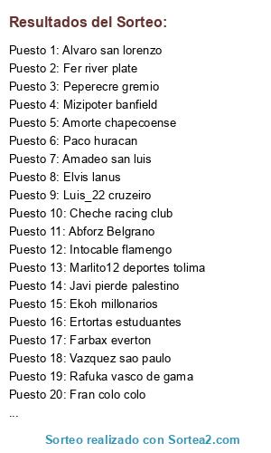Lista de participantes: Agu SP Cristal, Cheche racing club, Intocable flamengo, Abforz Belgrano, Xaviloko santos, Fran colo colo, Paco huracan, Xavi union española, Ekoh millonarios, Fer river plate, Valle boca juniors, Jpadfor Corinthians, Ertortas estuduantes, Mizipoter banfield, Fista velez, Amorte chapecoense, Lanki independiente de Medellin, Vazquez sao paulo, Alvaro san lorenzo, Elvis lanus, Amadeo san luis, Fabian at paranaense, Samperbe Audax Italiano, Falkone o.higgins, Javi pierde palestino, Bariceli- america de cali, Rafuka vasco de gama, Peperecre gremio, Gafas newells, Marlito12 deportes tolima, Luis_22 cruzeiro, Farbax everton.