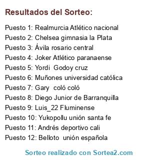 Lista de participantes: Diego Junior de Barranquilla, Andrés deportivo cali, Realmurcia Atlético nacional, Muñones universidad católica, Gary coló coló, Luis_22 Fluminense, Belloto unión española, Joker Atlético paranaense, Yukopollu unión santa fe, Ávila rosario central, Yordi Godoy cruz, Chelsea gimnasia la Plata.