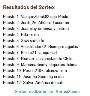 Lista de participantes: Juanplay defensa y justicia, Edu colon, Vazquezbook82 sao Paulo, Jordi_25 Atlético Tucumán, Josema Sporting cristal, Pedrin2106 alianza lima, Xevi santa fe, Acostillador82 Rionegro aguilas, Killote21 la equidad, Mariomartinely deportes Tolima, Salva América de cali, Roman universidad de Chile.