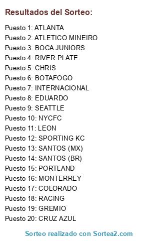 Lista de participantes: PORTLAND, SPORTING KC, SEATTLE, ATLANTA, BOCA JUNIORS, INTERNACIONAL, GREMIO, RIVER PLATE, CRUZ AZUL, MONTERREY, SANTOS (MX), EDUARDO, RACING, BOTAFOGO, NYCFC, COLORADO, ATLETICO MINEIRO, CHRIS, SANTOS (BR), LEON.